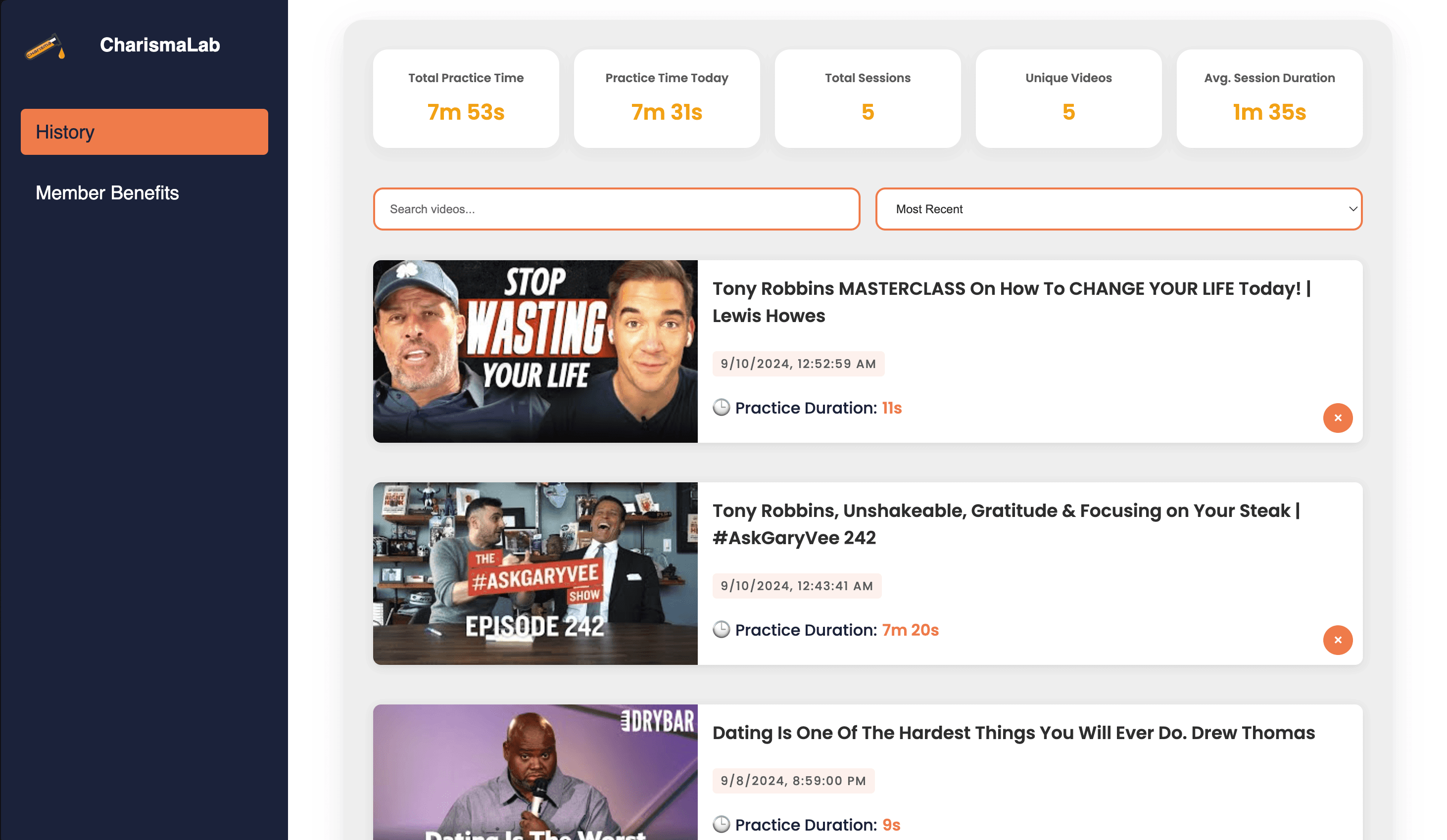 Track the time spent practicing each video.